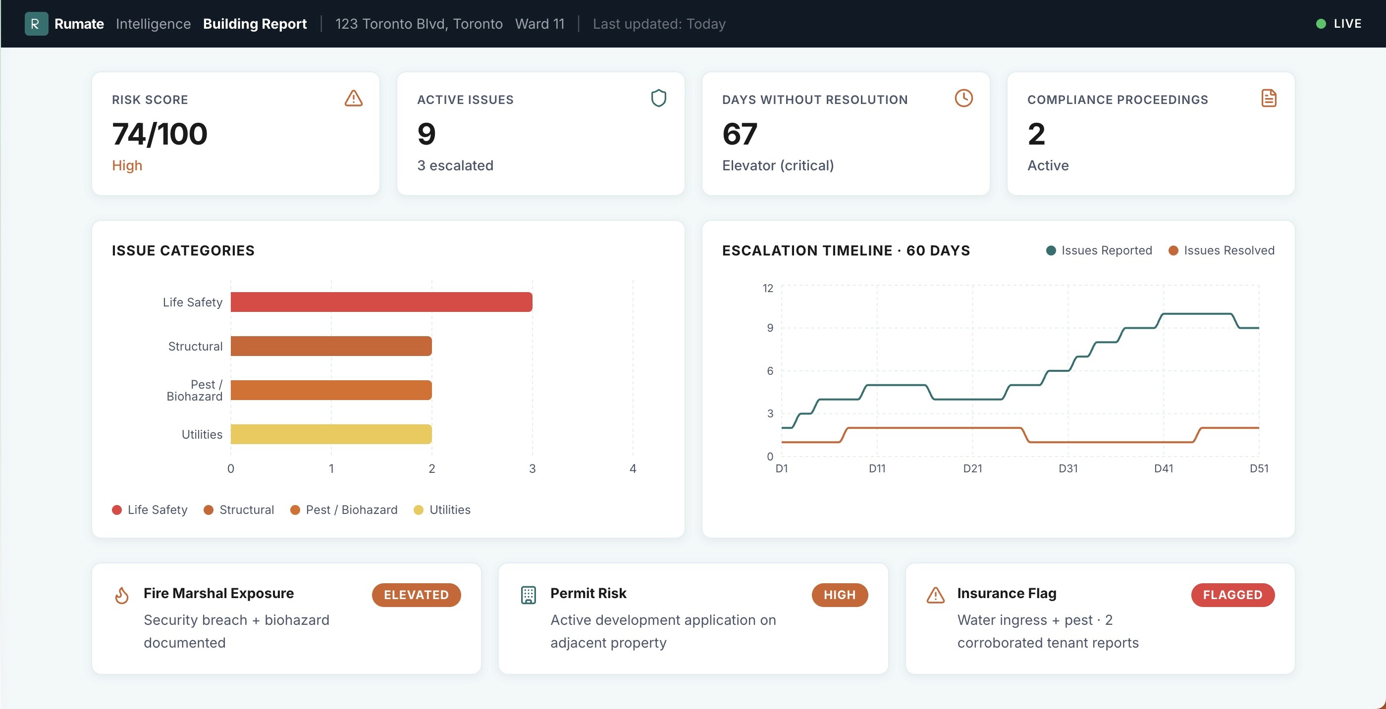 Rumate works with tenants to document building conditions in real time — maintenance failures, life-safety issues, security breaches, biohazards. Every report is timestamped, corroborated by multiple tenants, and legally structured into a verified building record. The result is property intelligence that has never existed before at this level of detail, consistency, or verifiability.
